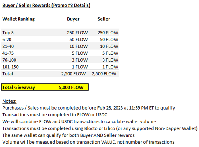 3. 5,000 FLOW airdrop to highest volume buyers / sellers (details below)